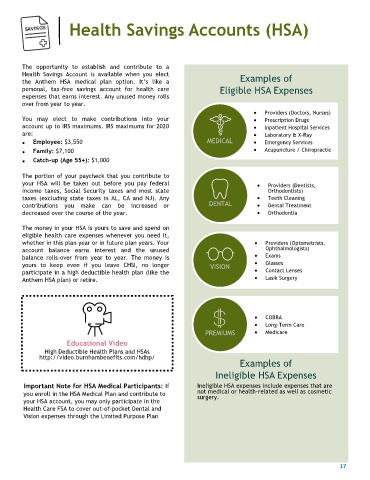 Important Note for HSA Medical Participants: If Ineligible HSA expenses include expenses that are