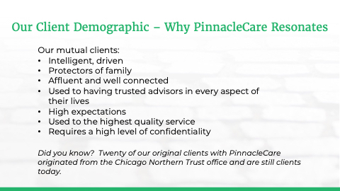 Did you know? Twenty of our original clients with PinnacleCare originated from the Chicago Northern Trust office and are still clients today.