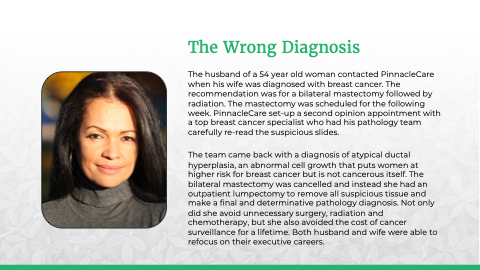 The husband of a 54 year old woman contacted PinnacleCare when his wife was diagnosed with breast cancer. The recommendation was for a bilateral mastectomy followed by radiation. The mastectomy was scheduled for the following week. PinnacleCare set-up a second opinion appointment with a top breast cancer specialist who had his pathology team carefully re-read the suspicious slides.