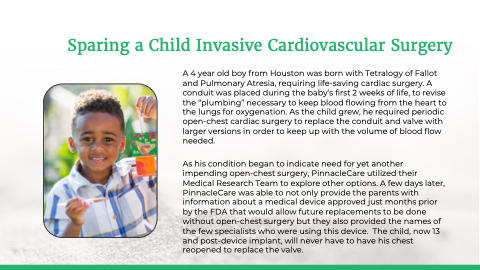 As his condition began to indicate need for yet another impending open-chest surgery, PinnacleCare utilized their Medical Research Team to explore other options. A few days later, PinnacleCare was able to not only provide the parents with information about a medical device approved just months prior by the FDA that would allow future replacements to be done without open-chest surgery but they also provided the names of the few specialists who were using this device. The child, now 13 and post-device implant, will never have to have his chest reopened to replace the valve.