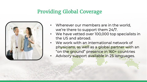 • We work with an international network of physicians, as well as a global partner with an “on the ground” presence in 160+ countries