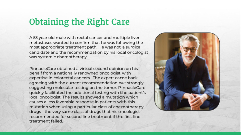 PinnacleCare obtained a virtual second opinion on his behalf from a nationally renowned oncologist with expertise in colorectal cancers. The expert came back, agreeing with the current recommendation but strongly suggesting molecular testing on the tumor. PinnacleCare quickly facilitated the additional testing with the patient’s local oncologist. The results showed a mutation which causes a less favorable response in patients with this mutation when using a particular class of chemotherapy drugs - the very same class of drugs that his oncologist recommended for second line treatment if the first line treatment failed.