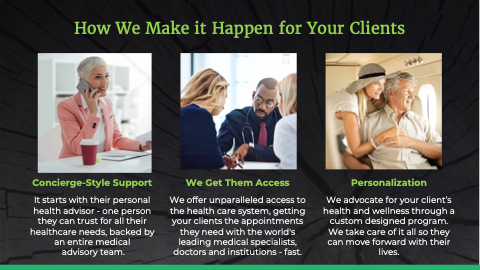 We offer unparalleled access to the health care system, getting your clients the appointments they need with the world's leading medical specialists, doctors and institutions - fast.