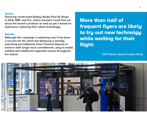 a success for the client and Samsung is already searching out additional Clear Channel Airports to invest in with longer term commitments, easy to install exhibits and additional supportive assets throughout the airport.