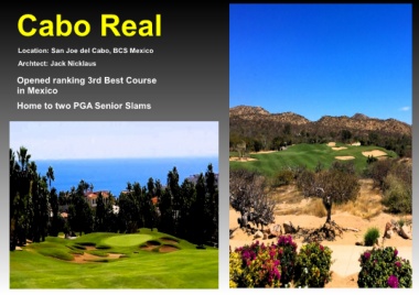 Cabo Real Location: San Joe del Cabo, BCS Mexico Archtect: Jack Nicklaus Opened ranking 3rd Best Course in Mexico Home to two PGA Senior Slams