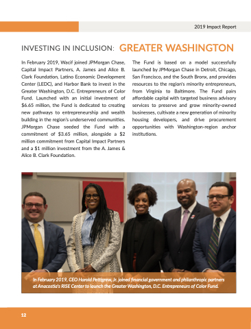 In February 2019 Wacif joined JPMorgan Chase Capital Impact Partners A A James and Alice B Clark Foundation Latino Economic Development Center (LEDC) and Harbor Bank to invest in in the Greater Washington D C C Entrepreneurs of Color Fund Launched with an initial investment of $6 65 million the Fund is dedicated to creating new pathways to entrepreneurship and wealth building in in the region’s underserved communities JPMorgan Chase seeded the Fund with a a a commitment of $3 65 million alongside a a $2 million commitment from Capital Impact Partners and a a a $1 million investment from the A James & Alice B Clark Foundation The Fund is based on a a model successfully launched by JPMorgan Chase in Detroit Chicago San Francisco and and the South Bronx and and provides resources to the region's minority entrepreneurs from Virginia to Baltimore The Fund pairs affordable capital with targeted business advisory services to preserve and grow minority-owned businesses cultivate a a a new generation of minority housing developers and drive procurement opportunities with Washington-region anchor institutions GREATER WASHINGTON