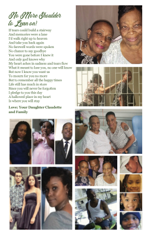 ! No chance to say goodbye To mourn for you no more But to remember all the happy times Life still has much in store I pledge to you this day Love; Your Daughter Claudette and Family