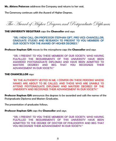 “SIR, I PRESENT TO YOU THESE MEMBERS OF OUR SOCIETY, WHO HAVING FULFILLED THE REQUIREMENTS OF THIS UNIVERSITY HAVE BEEN AWARDED POSTGRADUATE DIPLOMAS AND HAVE BEEN ADMITTED TO MASTERS DEGREES AND BEG THAT YOU RECOGNIZE THEIR ADVANCEMENT IN OUR SOCIETY.”