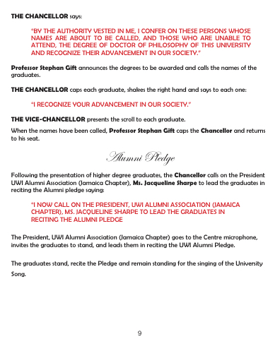 Following the presentation of higher degree graduates, the Chancellor calls on the President UWI Alumni Association (Jamaica Chapter), Ms. Jacqueline Sharpe to lead the graduates in reciting the Alumni pledge saying: