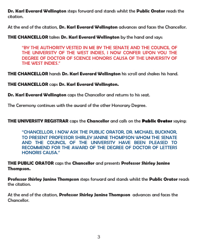 “BY THE AUTHORITY VESTED IN ME BY THE SENATE AND THE COUNCIL OF THE UNIVERSITY OF THE WEST INDIES, I NOW CONFER UPON YOU THE DEGREE OF DOCTOR OF SCIENCE HONORIS CAUSA OF THE UNIVERSITY OF THE WEST INDIES.”