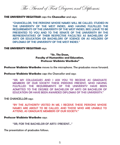 “CHANCELLOR, THE PERSONS WHOSE NAMES WILL BE CALLED, STUDIED IN THE UNIVERSITY OF THE WEST INDIES, AND HAVING FULFILLED THE REQUIREMENTS OF THE UNIVERSITY OF THE WEST INDIES, BEG LEAVE TO BE PRESENTED TO YOU AND TO THE SENATE OF THE UNIVERSITY BY THE REPRESENTATIVES OF THEIR RESPECTIVE FACULTIES AS BACHELORS OF ARTS OR EDUCATION OR BACHELORS OF SCIENCE OR AS HOLDERS OF DIPLOMAS OF THE UNIVERSITY OF THE WEST INDIES.”