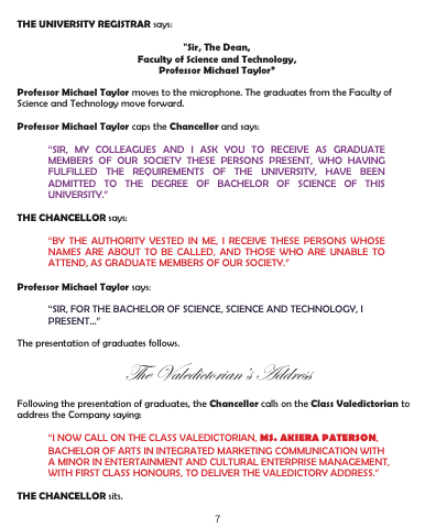 “I NOW CALL ON THE CLASS VALEDICTORIAN, MS. AKIERA PATERSON, BACHELOR OF ARTS IN INTEGRATED MARKETING COMMUNICATION WITH