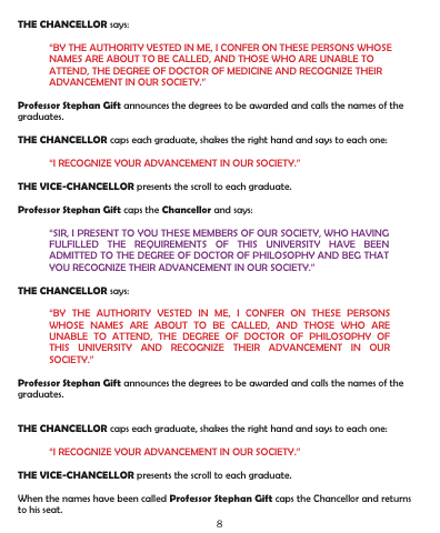 “SIR, I PRESENT TO YOU THESE MEMBERS OF OUR SOCIETY, WHO HAVING FULFILLED THE REQUIREMENTS OF THIS UNIVERSITY HAVE BEEN ADMITTED TO THE DEGREE OF DOCTOR OF PHILOSOPHY AND BEG THAT YOU RECOGNIZE THEIR ADVANCEMENT IN OUR SOCIETY.”