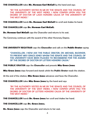“BY THE AUTHORITY VESTED IN ME BY THE SENATE AND THE COUNCIL OF THE UNIVERSITY OF THE WEST INDIES, I NOW CONFER UPON YOU THE DEGREE OF DOCTOR OF LETTERS HONORIS CAUSA OF THE UNIVERSITY OF THE WEST INDIES.”
