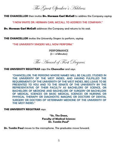 “CHANCELLOR, THE PERSONS WHOSE NAMES WILL BE CALLED, STUDIED IN THE UNIVERSITY OF THE WEST INDIES, AND HAVING FULFILLED THE REQUIREMENTS OF THE UNIVERSITY OF THE WEST INDIES, BEG LEAVE TO BE PRESENTED TO YOU AND TO THE SENATE OF THE UNIVERSITY BY THE REPRESENTATIVE OF THEIR FACULTY AS BACHELORS OF SCIENCE, OR BACHELORS OF MEDICINE AND BACHELORS OF SURGERY OR BACHELORS OF MEDICAL SCIENCES OR BASIC MEDICAL SCIENCES OR NURSING OR PHYSICAL THERAPY OR DIAGNOSTIC IMAGING OR DOCTORS OF DENTAL SURGERY OR DOCTORS OF VETERINARY MEDICINE OF THE UNIVERSITY OF THE WEST INDIES.”