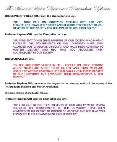“SIR, I NOW CALL ON PROFESSOR STEPHAN GIFT, PRO VICE- CHANCELLOR, GRADUATE STUDIES AND RESEARCH TO PRESENT TO YOU MEMBERS OF OUR SOCIETY FOR THE AWARD OF HIGHER DEGREES.”