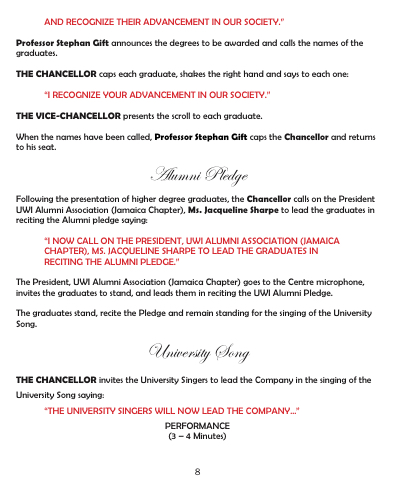 “I NOW CALL ON THE PRESIDENT, UWI ALUMNI ASSOCIATION (JAMAICA CHAPTER), MS. JACQUELINE SHARPE TO LEAD THE GRADUATES IN RECITING THE ALUMNI PLEDGE.”