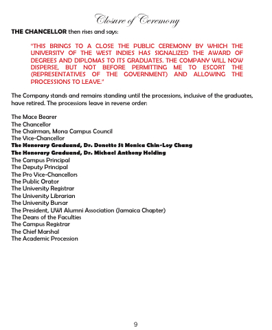 “THIS BRINGS TO A CLOSE THE PUBLIC CEREMONY BY WHICH THE UNIVERSITY OF THE WEST INDIES HAS SIGNALIZED THE AWARD OF DEGREES AND DIPLOMAS TO ITS GRADUATES. THE COMPANY WILL NOW DISPERSE, BUT NOT BEFORE PERMITTING ME TO ESCORT THE (REPRESENTATIVES OF THE GOVERNMENT) AND ALLOWING THE PROCESSIONS TO LEAVE.”