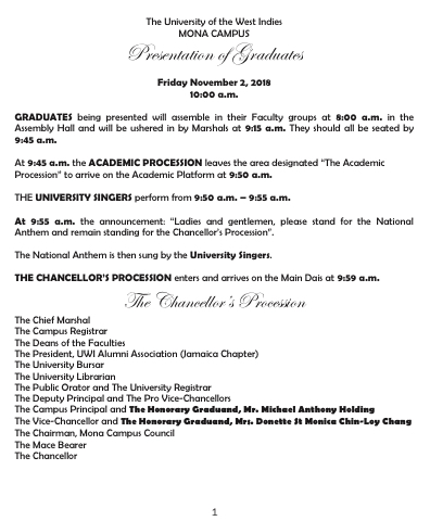 The Vice-Chancellor and The Honorary Graduand, Mrs. Donette St Monica Chin-Loy Chang The Chairman, Mona Campus Council