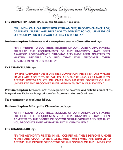 "BY THE AUTHORITY VESTED IN ME, I CONFER ON THESE PERSONS WHOSE NAMES ARE ABOUT TO BE CALLED, AND THOSE WHO ARE UNABLE TO ATTEND POSTGRADUATE DIPLOMAS AND MASTERS DEGREES OF THE UNIVERSITY AND RECOGNIZE THEIR ADVANCEMENT IN OUR SOCIETY.”
