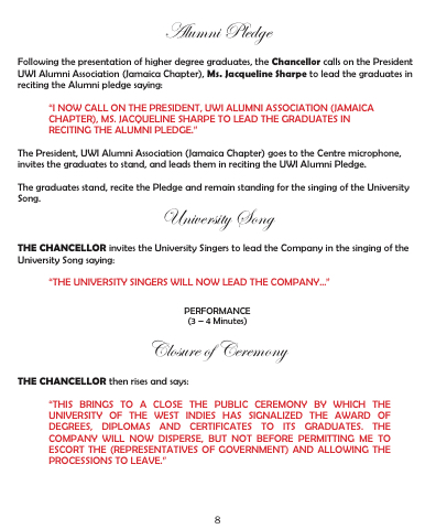 “THIS BRINGS TO A CLOSE THE PUBLIC CEREMONY BY WHICH THE UNIVERSITY OF THE WEST INDIES HAS SIGNALIZED THE AWARD OF DEGREES, DIPLOMAS AND CERTIFICATES TO ITS GRADUATES. THE COMPANY WILL NOW DISPERSE, BUT NOT BEFORE PERMITTING ME TO ESCORT THE (REPRESENTATIVES OF GOVERNMENT) AND ALLOWING THE PROCESSIONS TO LEAVE.”