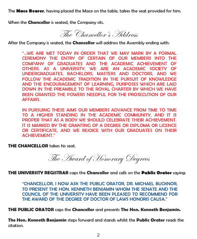 “CHANCELLOR, I NOW ASK THE PUBLIC ORATOR, DR. MICHAEL BUCKNOR, TO PRESENT THE HON. KENNETH BENJAMIN WHOM THE SENATE AND THE COUNCIL OF THE UNIVERSITY HAVE BEEN PLEASED TO RECOMMEND FOR THE AWARD OF THE DEGREE OF DOCTOR OF LAWS HONORIS CAUSA.”