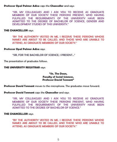 “SIR, MY COLLEAGUES AND I ASK YOU TO RECEIVE AS GRADUATE MEMBERS OF OUR SOCIETY THESE PERSONS PRESENT, WHO HAVING FULFILLED THE REQUIREMENTS OF THE UNIVERSITY HAVE BEEN ADMITTED TO THE DEGREE OF BACHELOR OF SCIENCE, GENDER AND DEVELOPMENT STUDIES OF THIS UNIVERSITY.”