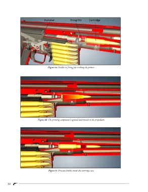 Figure 6a: Striker or firing pin striking the primer. Figure 6b: The priming compound is ignited and travels to the propellant. Figure 6c: Pressure builds inside the cartridge case. 32