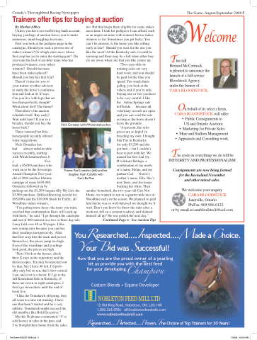 too. But that keeps them eligible for some stakes races later. I look for pedigrees I can afford, such as an unproven mare with winners but no stakes winners so far. Sometimes you get lucky. You can’t be anxious. Is the horse you like selling early or late? Should you wait for the one you like the most? At the Kentucky sale, it could be snowing and there may be a lull when other buy- ers are away when one that you like comes up.