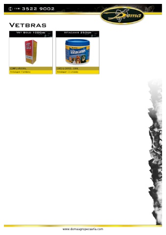 (18) 3522 9002 Vetbras Vet Gold 1000ml Vitacanis 250gr COMPL.VIT/ORAL CAES & GATOS - ORAL Embalagem: 6 unidades Embalagem: 12 unidades www.domaagropecuaria.com