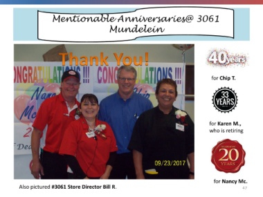 Mentionable Anniversaries@ 3061 Mundelein for Chip T. for Karen M., who is retiring for Nancy Mc. Also pictured #3061 Store Director Bill R. 47