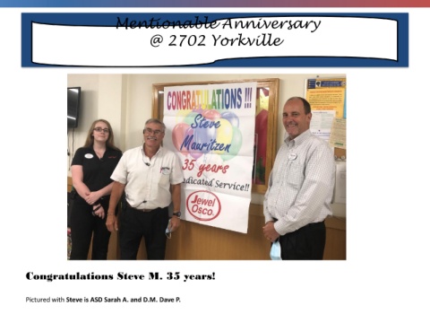 Mentionable Anniversary @ 2702 Yorkville Congratulations Steve M. 35 years! Pictured with Steve is ASD Sarah A. and D.M. Dave P.