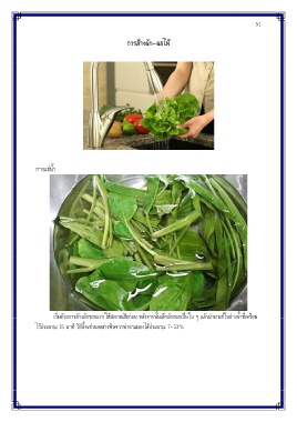 51 การล้างผัก-ผลไม้ การแช่น้ า เริ่มด้วยการล้างผักรอบแรกให้สะอาดเสียก่อน หลังจากนั้นเด็กผักออกเป็นใบ ๆ แล้วน ามาแช่ในอ่างน้ าที่เตรียม ไว้ประมาณ 15 นาที วิธีนี้จะช่วยลดสารพิษจากฆ่ายาแมลงได้ประมาณ 7-33%