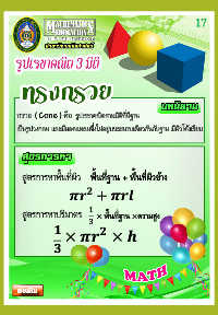 กรวย ( Cone ) คือ รูปเรขาคณิตสามมิติที่มีฐาน เป็นรูปวงกลม และมียอดแหลมซึ่งไม่อยู่บนระนาบเดียวกันกับฐาน มีผิวโค้งเรียบ สูตรการหาพื้นที่ผิว พื้นที่ฐาน + พื้นที่ผิวข้าง + 1 สูตรการหาปริมาตร × พื้นที่ฐาน ความสูง × 3 × ×