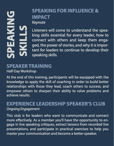 Listeners will come to understand the spea- king skills essential for every leader, how to connect with others and keep them enga- ged, the power of stories, and why it is impor- tant for leaders to continue to develop their speaking skills.