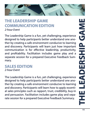 The Leadership Game is a fun, yet challenging, experience designed to help participants better understand one ano- ther by creating a safe environment conducive to learning and discovery. Participants will learn how to apply essenti- al sales principles such as rapport, trust, credibility, buy-in and persuasion. Facilitation includes game play and sepa- rate session for a prepared Executive Feedback Summary.