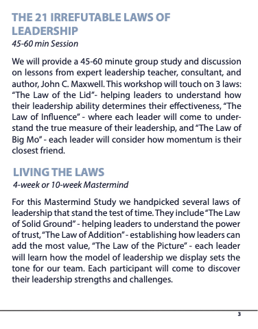 For this Mastermind Study we handpicked several laws of leadership that stand the test of time. They include “The Law of Solid Ground” - helping leaders to understand the power of trust,“The Law of Addition”- establishing how leaders can add the most value, “The Law of the Picture” - each leader will learn how the model of leadership we display sets the tone for our team. Each participant will come to discover their leadership strengths and challenges.
