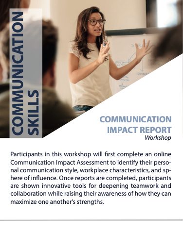 Participants in this workshop will first complete an online Communication Impact Assessment to identify their perso- nal communication style, workplace characteristics, and sp- here of influence. Once reports are completed, participants are shown innovative tools for deepening teamwork and collaboration while raising their awareness of how they can maximize one another’s strengths.