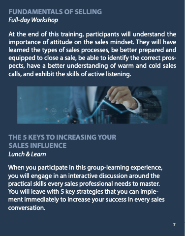 When you participate in this group-learning experience, you will engage in an interactive discussion around the practical skills every sales professional needs to master. You will leave with 5 key strategies that you can imple- ment immediately to increase your success in every sales conversation.