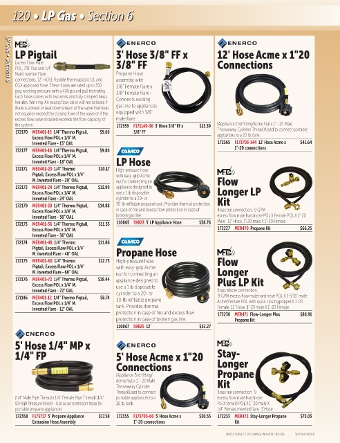 172173 MER401-36 1/4" Thermo Pigtail, $11.33 110065 59823 5' LP Appliance Hose $38.76 Male. 12' Hose, 1"-20 male X 1"-20 Female.