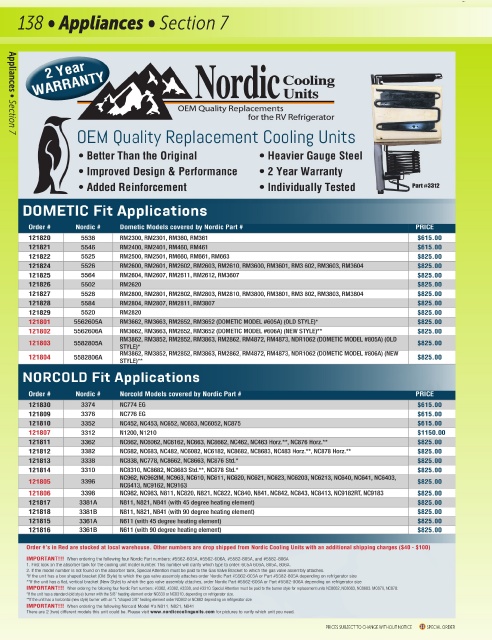Order #’s in Red are stocked at local warehouse. Other numbers are drop shipped from Nordic Cooling Units with an additional shipping charges ($40 - $100)