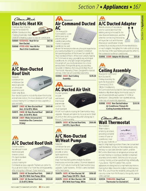 310074 15027 AC Ducted Roof Unit, $919.80 310078 15026 AC Non-Ducted, 15K $950.83 320334 7330G3351 Heat/Cool $71.40