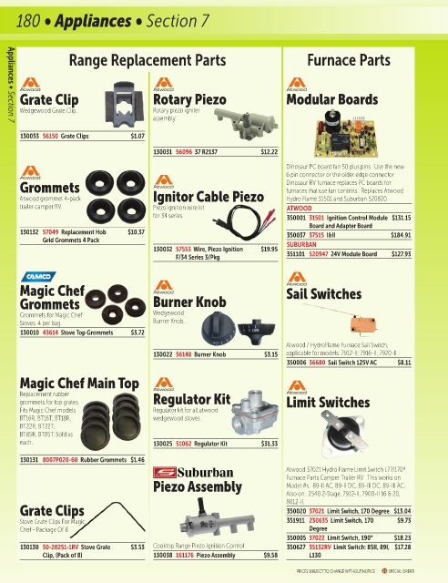 130130 50-20251-1RV Stove Grate $3.53 Cooktop Range Piezo Ignition Control 350627 35132RV Limit Switch: 85II, 89I, $17.28