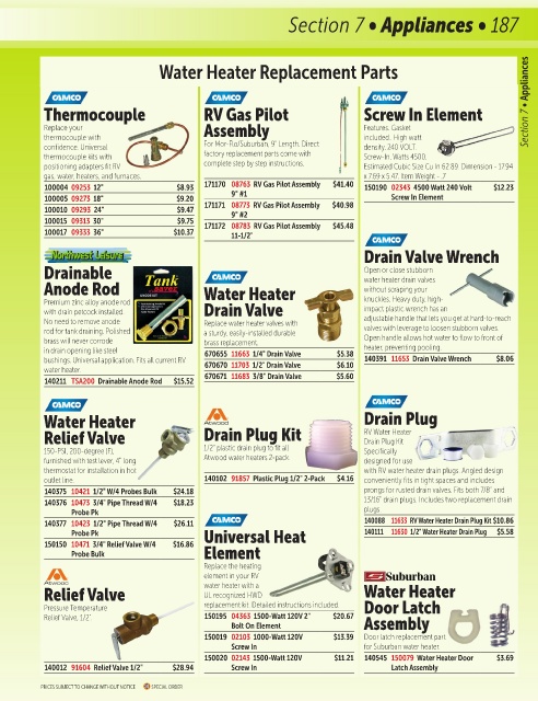 100004 09253 12" $8.93 171170 08763 RV Gas Pilot Assembly $41.40 150190 02343 4500 Watt 240 Volt $12.23