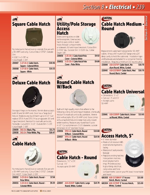 200033 S-23-14-A Cable Hatch, Round - $9.39 220047 A10-2135VP Cable Hatch, Large $10.70 681304 A10-2171VP 5" Access Hatch, $15.00
