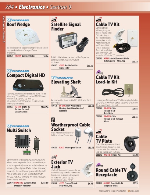 020074 SWM-840 Switch Kit for $283.50 030068 47755 Exterior TV Jack, $6.45 210018 08-6209 Round Cable TV $7.99