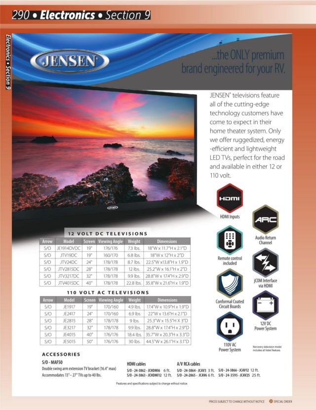 Accommodates 13"– 27" TVs up to 40 lbs. S/O - 24-3863 - JCHDMI12 12 ft. S/O - 24-2865 - JCAV6 6 ft. S/O - 24-3595 - JCAV25 25 ft.