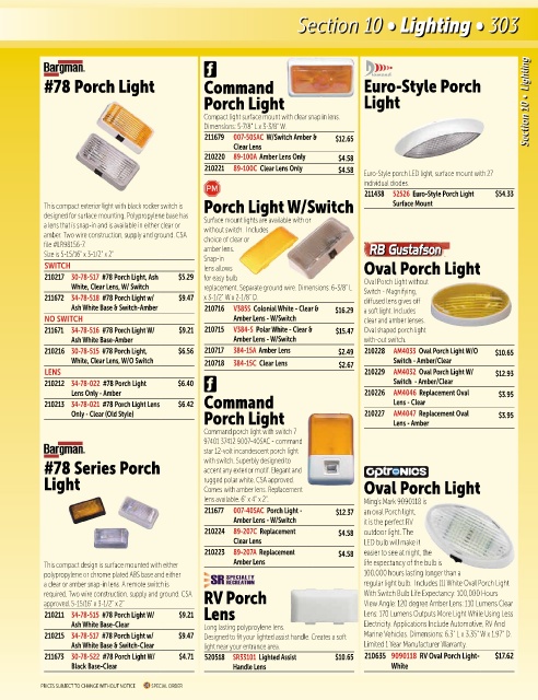 210216 30-78-515 #78 Porch Light, $6.56 210717 384-15A Amber Lens $2.49 210228 AM4033 Oval Porch Light W/O $10.65