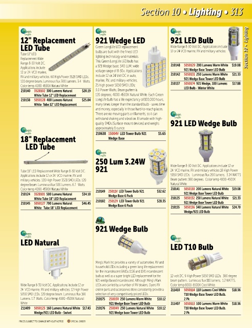 210145 5050127 700 Lumens Natural $46.45 210182 25012V LED Tower Bulb 921 $28.35 921 Wedge Base Tower LED Bulb