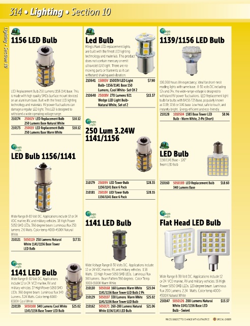 210139 5050108 340 Lumens Cool White $25.02 210162 5050171 260-280 Lumens Natural $21.06 White 1141/1156 Base LED